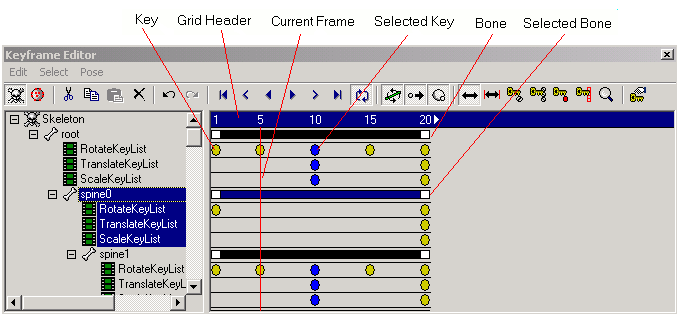 - Clicking and dragging a bone in the grid will move all the keys on the selected bones.