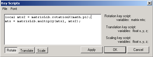 - Selecting Rotate, Translate or Scale in the key script editor chooses the type of keys for which you are writing a script. Each type of script has it's own