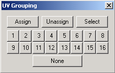 To remove uv coords from a group, click the 'Unassign' button and the group number. Choosing 'none' when the Assign button is depressed will clear the uv group assignments from the selected coords. Choosing 'none' when the Select button is depressed will deselect all uv coords. UV coords can be assigned to any or all of the uv groups.